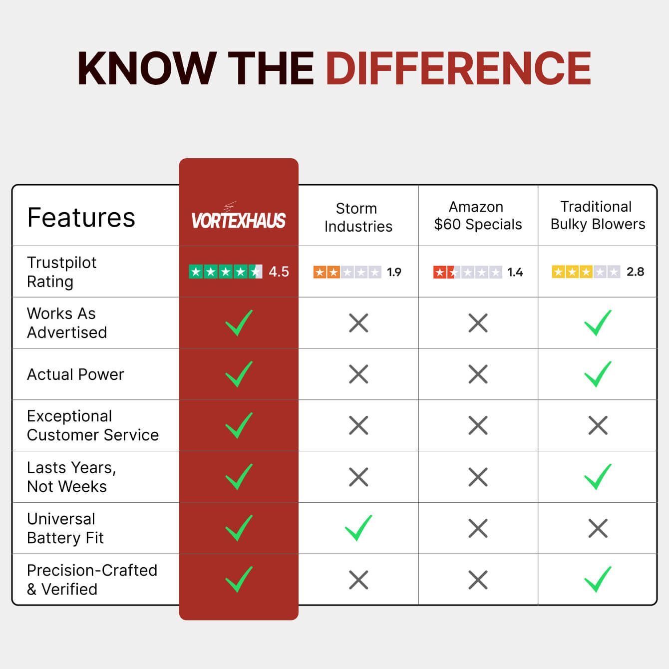 - Featuring VortexHaus Sync™ — the one-and-only system instantly compatible with your DeWalt, Makita, or Milwaukee 18–21V packs. No new batteries. No chargers. Just pure pro-grade power.